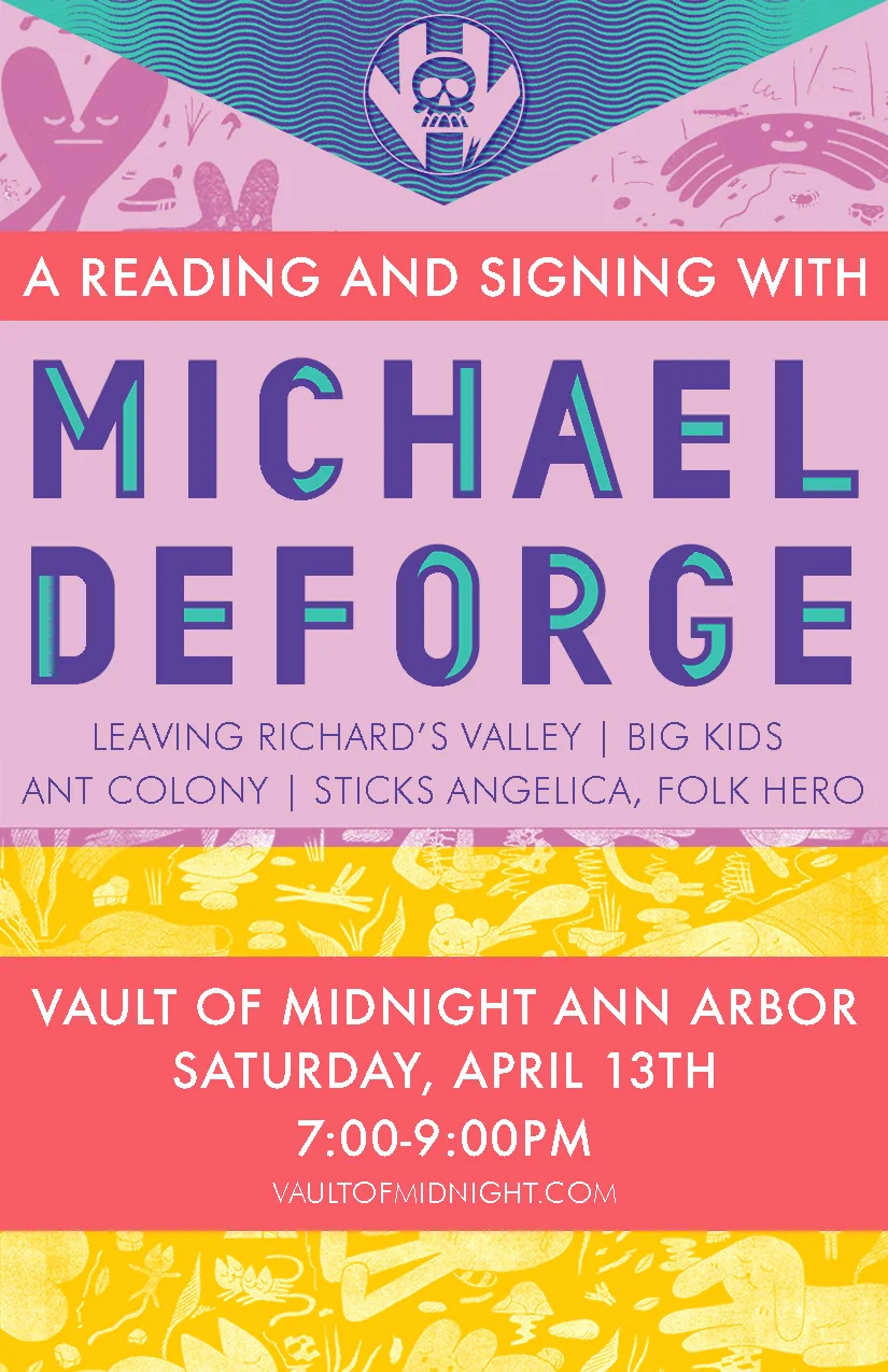The reading will take place in the Ultralounge, nestled beneath Vault of Midnight Ann Arbor, at 7pm and will be followed by a signing. Come celebrate this exciting book launch for Leaving Richard’s Valley by meeting Eisner-award winning creator, Michael DeForge, for a very special event at our Downtown Ann Arbor location!