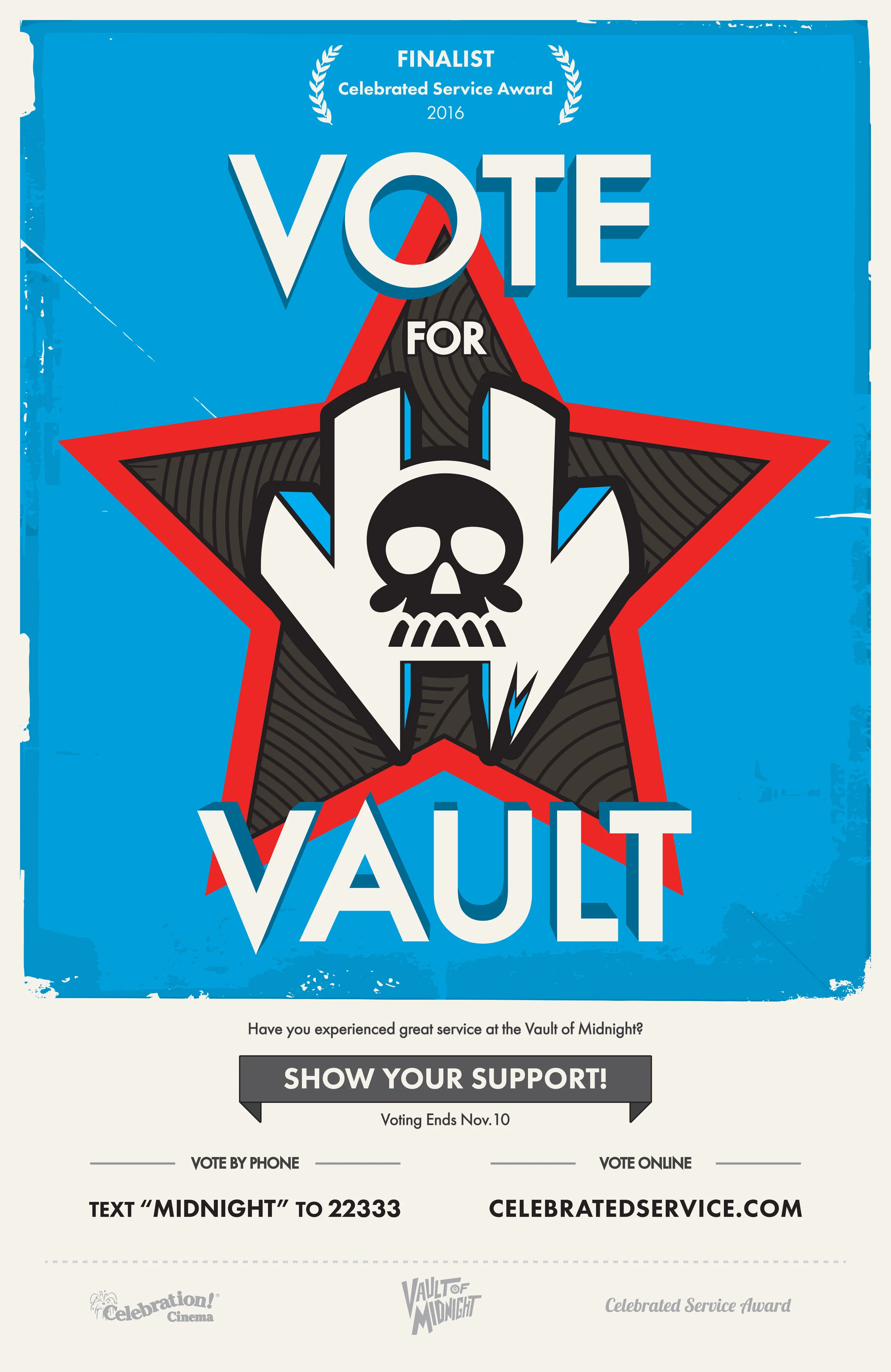 Simply text MIDNIGHT to 22333 or visit celebratedservice.com to Vote for Vault! Then, let us know so we can give you the highest of fives! Voting ends November 10th.