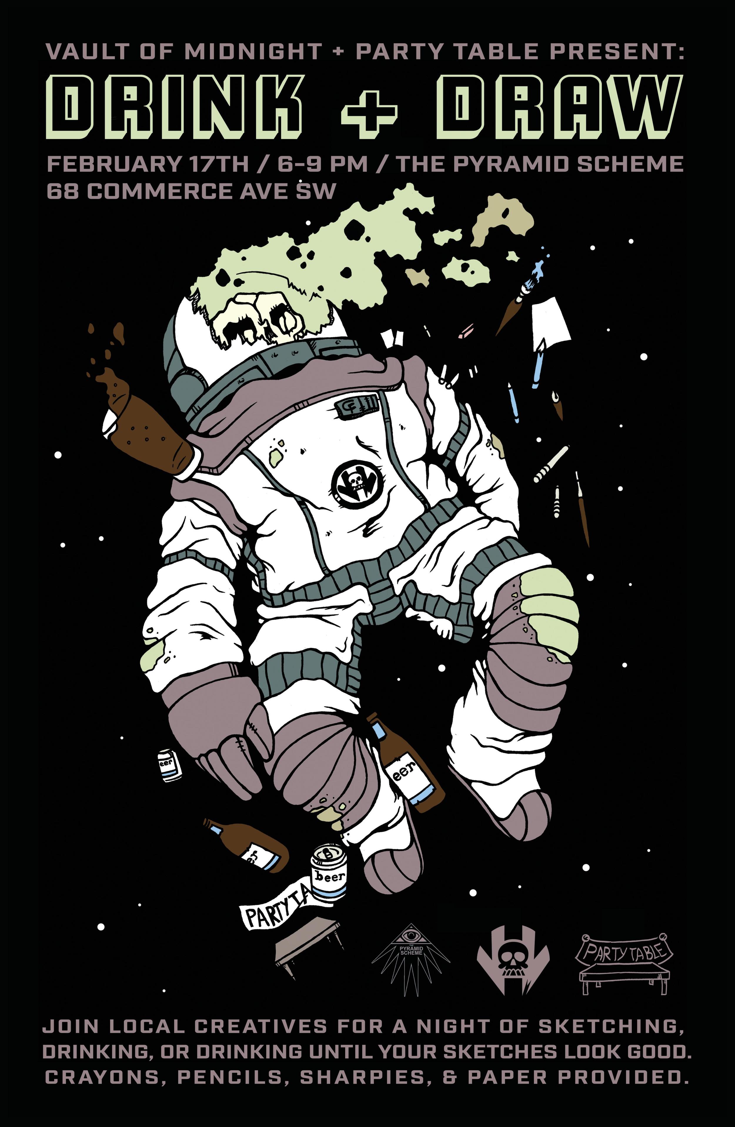 Come unwind and refresh your mental palette at a very special Vault of Midnight edition of Party Table's Drink and Draw. Join us at the Pyramid Scheme for an evening of sketching, drinking, or just drinking until your sketches look good. You bring your mad skills, or "talent," we’ll bring the art supplies.