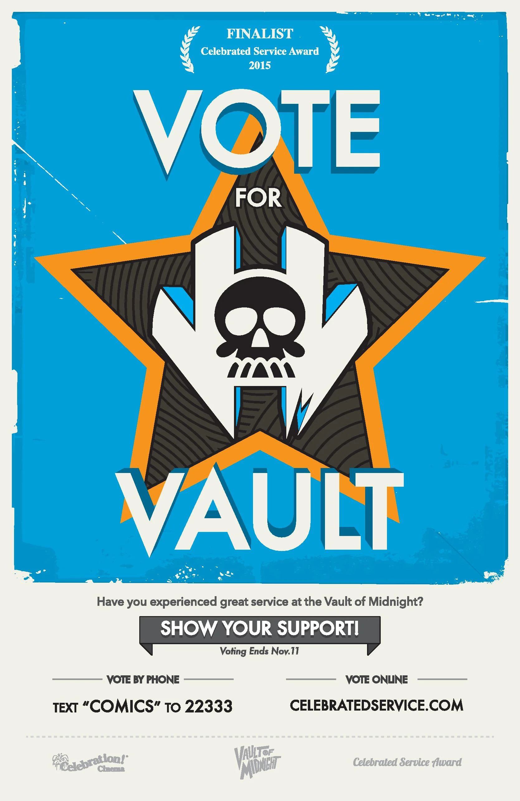 Simply text COMICS to 22333 or visit celebratedservice.com to Vote for Vault! Then, let us know so we can give you the highest of fives! Voting ends November 11th.